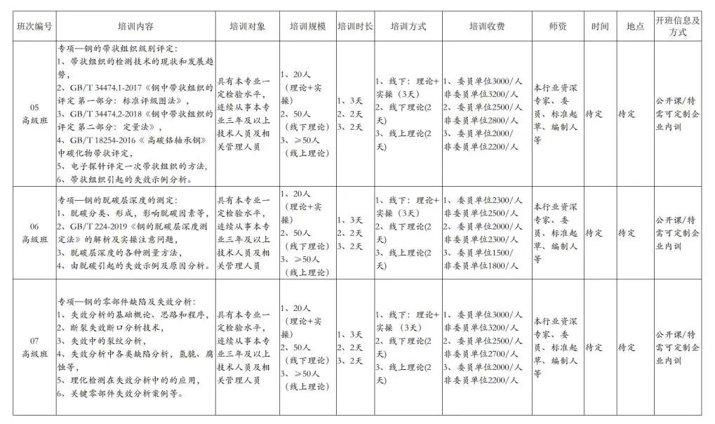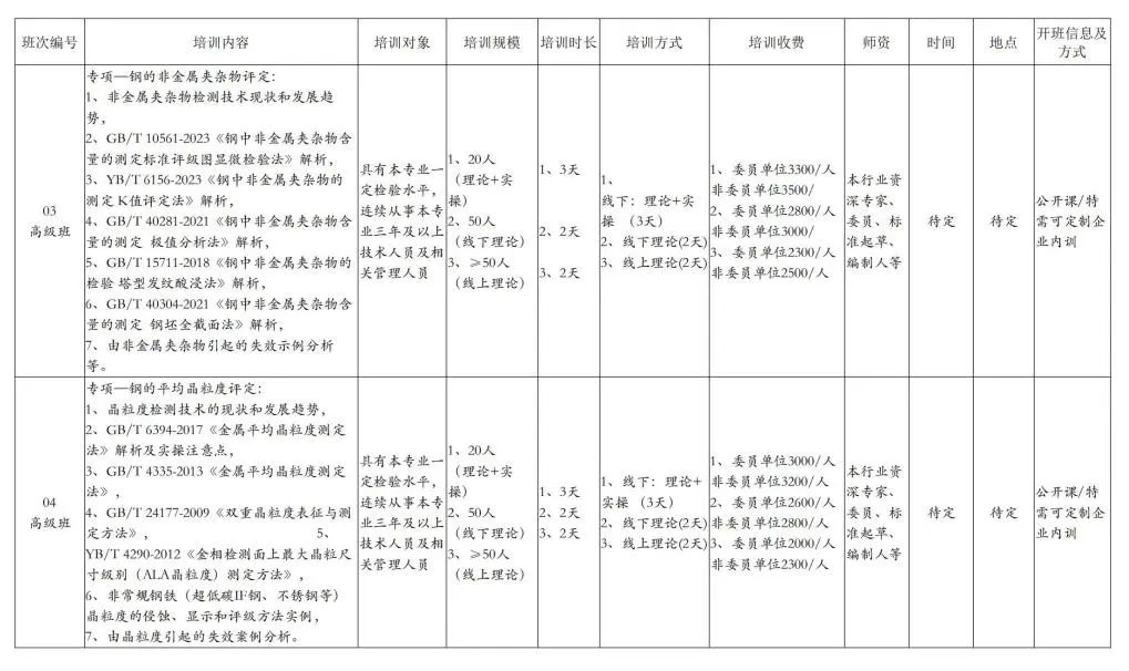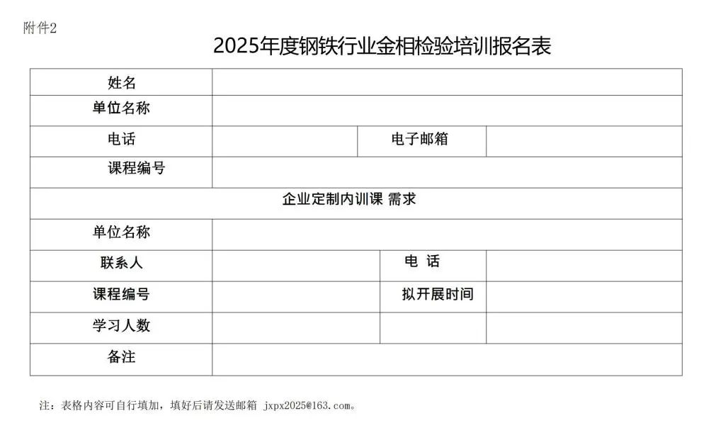 關(guān)于鋼鐵行業(yè)2025年度 各有關(guān)單位: 隨著鋼鐵行業(yè)的發(fā)展以及鋼鐵產(chǎn)品的多元化,鋼鐵產(chǎn)品檢驗行業(yè)人才的培養(yǎng)工作也將進(jìn)入一個全新階段。為了進(jìn)一步提升我國金相檢驗分析技術(shù)領(lǐng)域從業(yè)人員的專業(yè)技能與理論水平,促進(jìn)金相分析技術(shù)的創(chuàng)新與應(yīng)用,由全國鋼標(biāo)委金相檢驗方法分技術(shù)委員會組織鋼鐵行業(yè)金相檢驗方法技術(shù)方面的培訓(xùn)。通過開展鋼鐵行業(yè)金相檢驗方法領(lǐng)域多層次、多項目、多形式的內(nèi)容培訓(xùn),全面提升本行業(yè)檢驗技術(shù)水平和創(chuàng)新能力,為我國鋼鐵行業(yè)高質(zhì)量發(fā)展提供強有力的檢測分析人才保障。結(jié)合當(dāng)前金相檢測技術(shù)水平和各企事業(yè)發(fā)展的需求,充分發(fā)揮平臺作用,2025年度培訓(xùn)計劃及有關(guān)事項通知如下: 一、培訓(xùn)內(nèi)容及師資 本年度培訓(xùn)在充分征求各企事業(yè)單位需求的基礎(chǔ)上形成,根據(jù)不同層次的檢測技術(shù)人員需求,課程主要分為初級班、中級班和高級班。培訓(xùn)形式包含線下理論課+實操、線下理論課和線上理論課等多種方式,師資主要邀請本行業(yè)資深專家、委員、標(biāo)準(zhǔn)起草或編制人等國內(nèi)的專家進(jìn)行授課。同時為了大家有好的培訓(xùn)效果,線下課程采取規(guī)模定額制,保證學(xué)習(xí)人員對培訓(xùn)內(nèi)容的充分理解和運用。培訓(xùn)內(nèi)容安排見附件1《2025年度鋼鐵行業(yè)金相檢驗培訓(xùn)計劃表》。 二、培訓(xùn)報名 各單位相關(guān)技術(shù)人員可結(jié)合自身需求和附件1《2025年度鋼鐵行業(yè)金相檢驗培訓(xùn)計劃表》選擇課程。對于企業(yè)定制內(nèi)訓(xùn)的需求項目可也報名。 培訓(xùn)主辦方在收到各單位人員報名信息后,根據(jù)報名的人數(shù)和課程內(nèi)容需求,合理安排培訓(xùn)班級規(guī)模、培訓(xùn)的時間、地點、住宿、繳費方式、行車路線等,并及時告知報名人員相關(guān)培訓(xùn)的具體事宜。 三、報名方式 本年度使用微信和電子郵件兩種報名方式,各單位可于2025年1月31日前任選其中一種方式報名。 方式一:微信報名 請使用微信掃描以下二維碼填報 方式二:電子郵件報名 請?zhí)顚?025年度鋼鐵行業(yè)金相檢驗培訓(xùn)報名表(附件2)通過電子郵件發(fā)送至郵箱(jxpx2025@163.com)。 四、培訓(xùn)費用 培訓(xùn)根據(jù)課程的天數(shù)和內(nèi)容收取費用(線下課程一般含講課費、資料費、餐費,不含住宿費,線上課程含講課費、資料費),委員報名單位可適當(dāng)減少培訓(xùn)費用,具體費用以附件1培訓(xùn)通知為準(zhǔn)。如單位或企業(yè)有人員培訓(xùn)的需求可與聯(lián)系人商討。 五、聯(lián)系方式 聯(lián)系人:周曉偉 電 話:010-88297418 135 8153 8398 郵 箱:jxpx2025@163.com