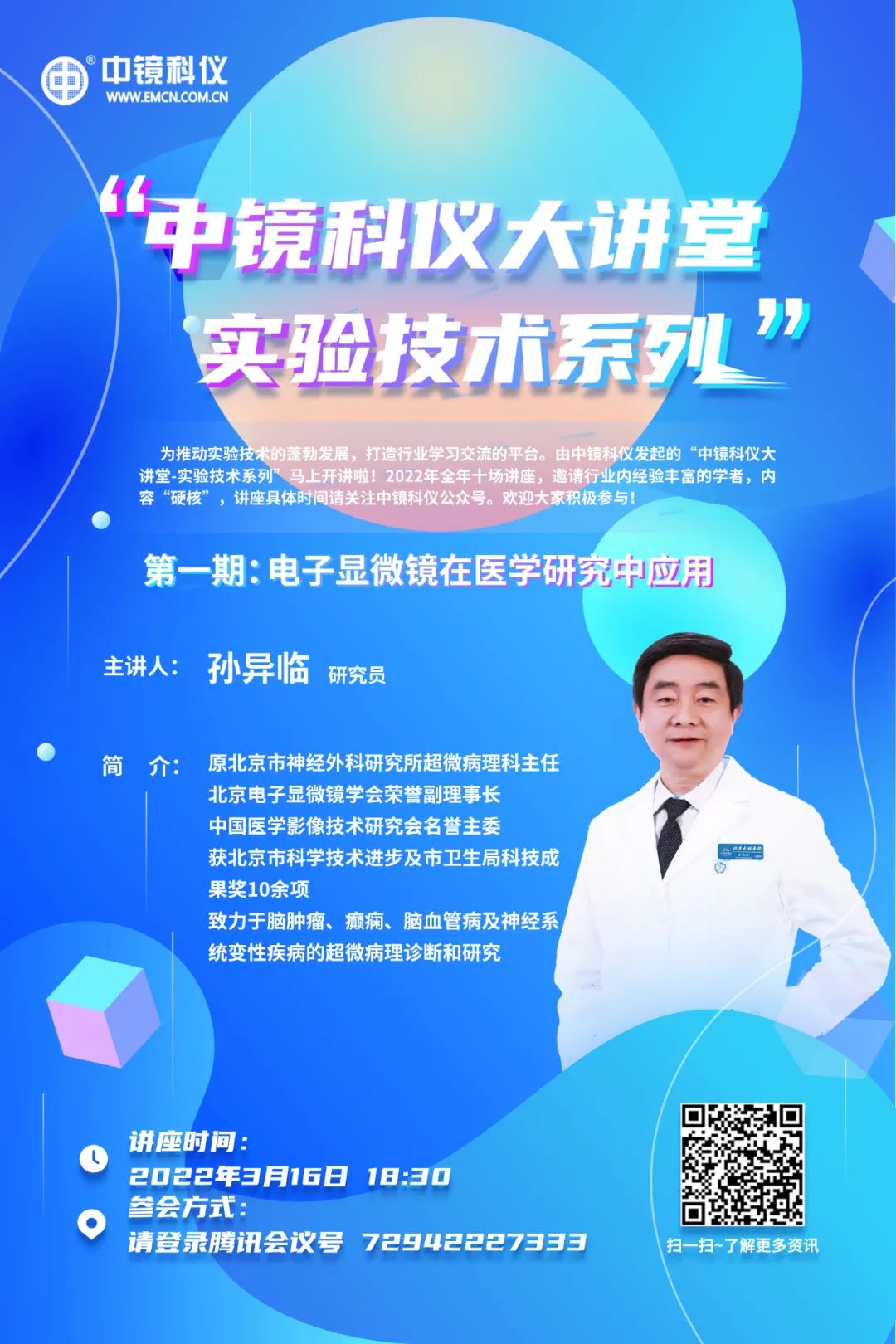為推動實驗技術的蓬勃發展,打造行業學習交流的平臺。由中鏡科儀發起的“中鏡科儀大講堂-實驗技術系列”馬上開講啦!2022年全年十場講座,邀請行業內經驗豐 富的學者,內容“硬核”,講座具體時間請關注中鏡科儀公眾號。歡迎大家積極參與! 第一期:電子顯微鏡在醫學研究中應用 主講人: 孫異臨 研究員 簡介: 原北京市神經外科研究所超微病理科主任 北京電子顯微鏡學會榮譽副理事長 中國醫學影像技術研究會名譽主委 獲北京市科學技術進步及市衛生局科技成果獎10余項 致力于腦腫瘤、癲癇、腦血管病及神經系統變性疾病的超微病理診斷和研究 講座時間: