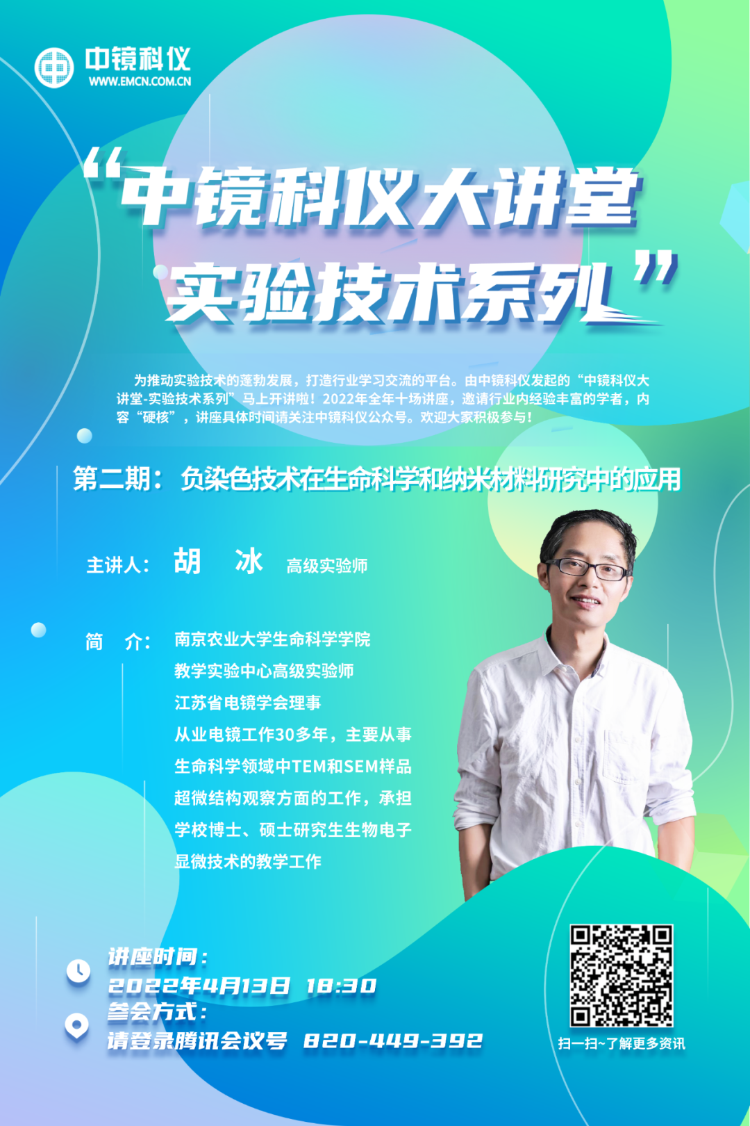 第二期:負染色技術在生命科學和納米材料研究中的應用 主講人: 胡 冰 高級實驗師 講座時間: 2022年4月13日 18:30 騰訊會議號:820449392 中鏡科儀打造世界一流品牌電鏡服務與供應商 中鏡科儀創始于2006年北京中關村高新開發區,以電子顯微鏡(簡稱電鏡)耗材及其周邊設備等為主營產品,是一家集研發、生產、銷售、技術服務、人才培養為一體的國家級科技型企業,在南京、廣州、沈陽、西安、鄭州、開封建立分公司,用戶面向高校實驗室、研究所等科研單位。2016年4月,公司將總部由北京遷至開封,在開封自貿區成立河南中鏡科儀科技有限公司,先后獲批開封市電子顯微鏡技術工程研究中心、河南省級新型研發機構等多個研發平臺。2020年由省發改委、教育廳批準進入河南省第一批產教融合型企業培育庫。公司現有員工150余人,超凈實驗室4所。